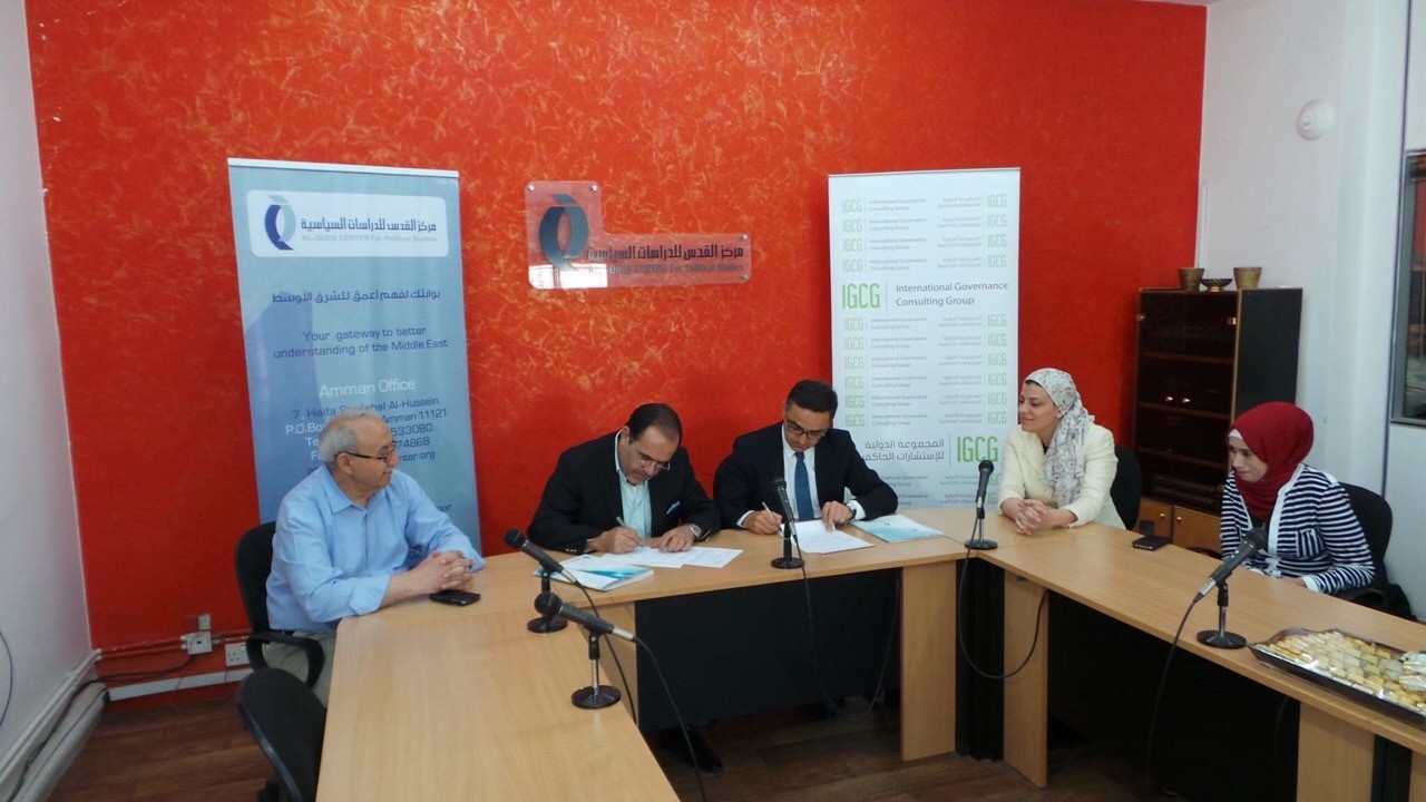 IGCG and Al-Quds Center signed a strategic partnership for Easter Europe and Middle East Inter-Cultural and Religious Dialogue. THIS Memorandum of Understanding (“MOU”), dated as of May 21, 2015, is between the International Governance Consulting Group, with head office in Prishtina, Fehmi Agani, street nr. 24/3, 10000 Prishtinë, Republic of Kosovo, hereinafter referred to as the “IGCG,” and the Al-Quds Center for Political Studies, hereinafter referred to as "Al-Quds," an independent Jordanian research institute, located at P.O. Box 213566, Amman, Jordan 11121.
