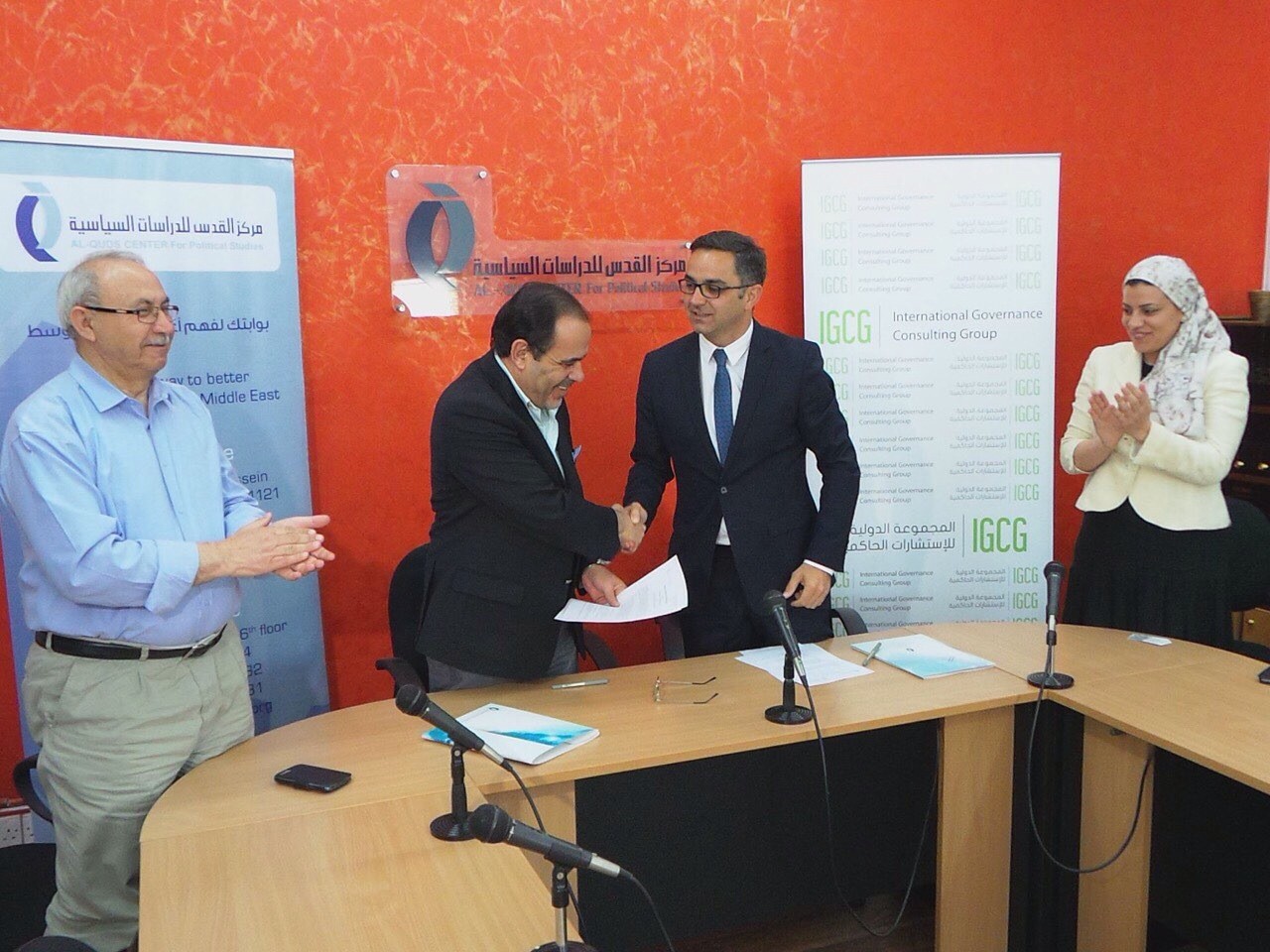 IGCG and Al-Quds Center signed a strategic partnership for Easter Europe and Middle East Inter-Cultural and Religious Dialogue. THIS Memorandum of Understanding (“MOU”), dated as of May 21, 2015, is between the International Governance Consulting Group, with head office in Prishtina, Fehmi Agani, street nr. 24/3, 10000 Prishtinë, Republic of Kosovo, hereinafter referred to as the “IGCG,” and the Al-Quds Center for Political Studies, hereinafter referred to as "Al-Quds," an independent Jordanian research institute, located at P.O. Box 213566, Amman, Jordan 11121.